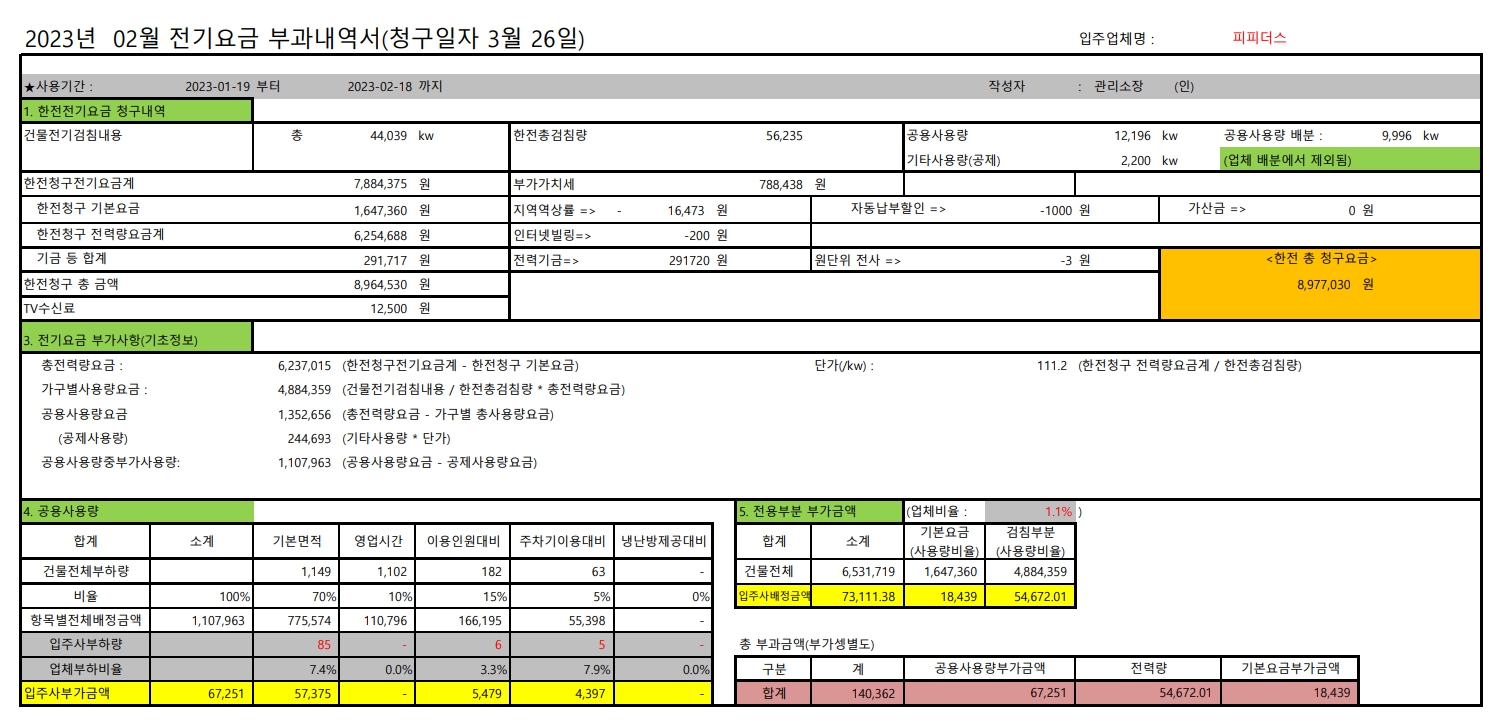 이 과정을 통해 각 입주자에게 분배되는 전기 요금을 계산할 수 있습니다. 또한, 한전에서 부과된 전력기금 및 TV 수신료는 보통 건물주가 부담합니다.