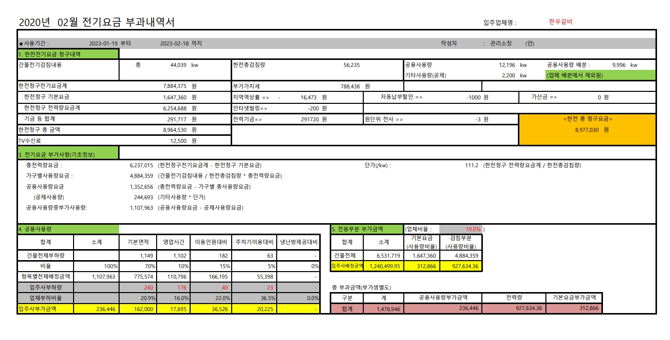 한전은 각 입주자의 사용량에 대한 전기요금을 직접 청구합니다.