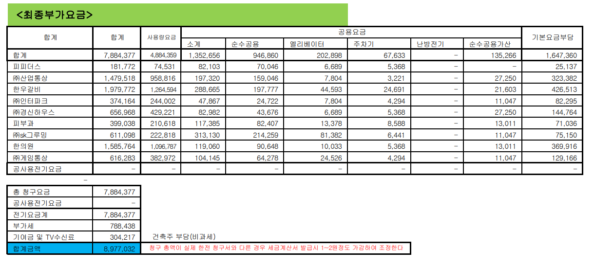 건물 전체의 전기 요금이 한전으로부터 청구됩니다.