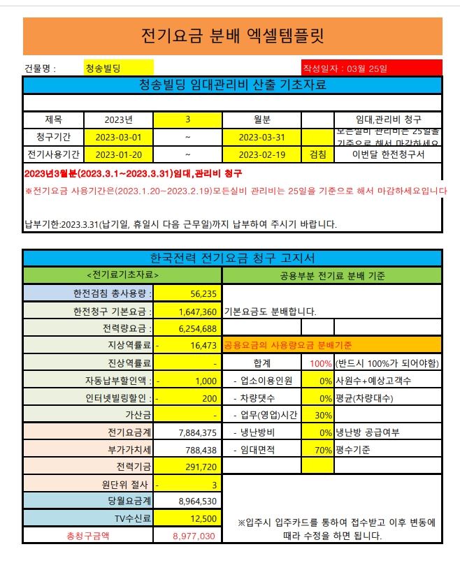 이 엑셀 템플릿은 주로 건물주가 직접 계량기를 설치해 사용하는 경우에 유용하지만, 한전 계량기 설치 시에도 공용 부분의 분배에 활용할 수 있습니다. 이 방법을 통해 공정하고 투명한 전기 요금 분배가 가능하며, 이는 입주민들 사이의 신뢰와 만족도를 높일 수 있습니다.